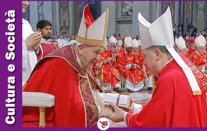 All’inizio della celebrazione eucaristica, dopo aver accolto la prescritta formula di giuramento, con la quale gli arcivescovi metropoliti si sono impegnati a essere fedeli e obbedienti “al beato Pietro apostolo, alla santa apostolica Chiesa di Roma, al Sommo Pontefice, ai suoi legittimi successori”, il Santo Padre ha benedetto i Palli, «scelti a simboleggiare la realtà della cura pastorale» che saranno imposti dal rappresentante pontificio a tutti gli arcivescovi metropoliti nominati nel corso dell’anno, a ciascuno nella propria Chiesa metropolitana. Durante l’omelia il Papa ha ricordato che «il Sinodo che stiamo celebrando ci chiama a diventare una Chiesa che si alza in piedi, non ripiegata su sé stessa, capace di spingere lo sguardo oltre, con il coraggio di aprire le porte. Secondo una bella tradizione, ho benedetto i Palli per gli arcivescovi metropoliti. In comunione con Pietro, essi sono chiamati ad “alzarsi in fretta”, non dormire, per essere sentinelle vigilanti del gregge e, alzati, “combattere la buona battaglia”, mai da soli, ma con tutto il santo Popolo fedele di Dio. E come buoni pastori devono stare davanti al popolo, in mezzo al popolo e dietro al popolo, ma sempre con il santo popolo fedele di Dio, perché loro sono parte del santo popolo fedele di Dio».