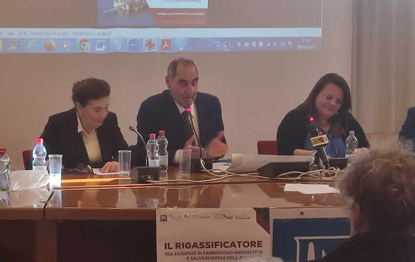 L’ing. Pino Solano, titolare di un’azienda con sede a Vibo Valentia, leader del settore della consulenza e progettazione di torce ed inceneritori, che ha realizzato l’impiantistica a servizio di rigassificatori di tutto il mondo, partendo dal fabbisogno attuale di gas in Italia, si è soffermato sulle varie possibilità di approvvigionamento (estrazione, gasdotti e rigassificatori), sulle caratteristiche dei rigassificatori e sulla loro messa in sicurezza, proiettando alcuni lucidi del rigassificatore galleggiante di Piombino, la cui torcia è stata progettata e costruita proprio dalla sua azienda.
