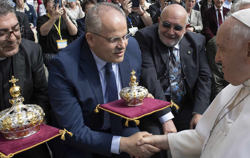 Un incontro intenso e carico di emozioni quello vissuto in Piazza San Pietro lo scorso 3 aprile, in occasione dell’Udienza Generale concessa dal Santo Padre per la benedizione delle due nuove corone realizzate dal maestro orafo Michele Affidato che incoroneranno la Madonna di Polsi. All’incontro erano presenti il Rettore del Santuario di Polsi, Don Tonino Saraco, Nino Romeo Custode della Sacra Effige e Procuratore per Bagnara Calabra ed il maestro Michele Affidato, accompagnati da Don Gianluca Longo, parroco di San Luca e da Don Giuseppe Alfani, parroco di Siderno, collaboratori del Rettore del Santuario di Polsi. Grande gioia per i presenti, che hanno potuto mostrare le opere a Papa Francesco il quale si è fermato per osservarle prima di benedirle. Don Tonino Saraco ha esordito: “Santo Padre sono il Rettore del Santuario di Polsi, queste sono le nuove corone che abbiamo realizzato per la nostra venerata Vergine”. Nel momento della stretta di mano Michele Affidato ha tenuto a ringraziare Papa Francesco: “Santità siate forte, abbiamo bisogno dei vostri messaggi di speranza. Venga a farci visita in Calabria”. Nino Romeo: “Santità una preghiera per tutti i fedeli della Madonna di Polsi”. Quello di mercoledì è stato dunque un ulteriore passo verso la grande festa che si celebrerà il prossimo 31 maggio con l’incoronazione della statua della Madonna di Polsi. Un evento, quello dell’incoronazione, atteso da moltissimi fedeli calabresi e non solo, che hanno potuto, in questi ultimi mesi, pregare ed ammirare la statua che ha fatto visita in diverse Diocesi della Calabria. Il 31 maggio prossimo, dunque, in occasione della chiusura del mese Mariano, si terrà in Piazza Municipio a Bagnara Calabra la solenne Celebrazione Eucaristica a conclusione della “Peregrinatio Mariae”, che presieduta da Mons. Fortunato Morrone, Arcivescovo Metropolita di Reggio Calabria - Bova e concelebrata da Mons. Francesco Oliva, Vescovo di Locri - Gerace e Mons. Francesco Milito, Vescovo di Oppido Mamertina - Palmi. Nel corso della solenne concelebrazione, il simulacro di Maria SS. della Montagna verrà incoronato alla presenza delle massime cariche istituzionali della Regione.