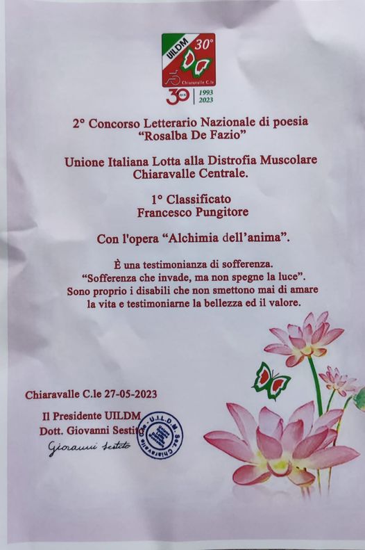 Primo posto per “Alchimia dell'Anima” con cui l’autore tocca il tema della disabilità, come sofferenza che si trasmuta in forza e rinascita